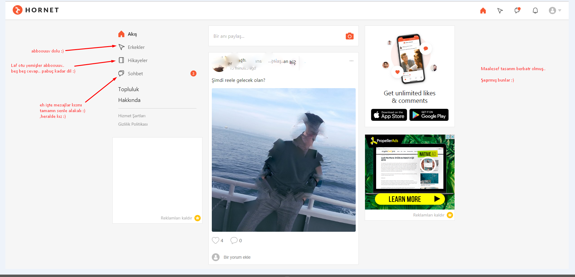 Bir arkadaşlık ve sohbet sitesinden farklı olarak daha fazla iletişim ve paylaşım olanağı sunan bir sosyal medya platformu gibi davranan hornette bir sınırlama olmalı mı, inanın ki emin değilim. Zaten sınırlama var da bunu yönetebilecek bir kadro olmaması çok rahtatsız edici. Çünkü farkedilir edilmez yetişkin içerikli resimler siliniyor. Neden? çünkü ya kullanıcılar şikayet ediyor yada yöneticiler görüyor. Ancak, Tanışmak istediğiniz insanların vücut veya yüz resimleri yerine, sadece penisleri, anüsleri vb kişinin bütünlüğüyle alakası olmayan fotoların siz istemeden karşınıza çıkması rahatsız edici veya saygısızlık değil mi? Bu tarz resimlerin her dakika karşınıza çıktıktan sonra silinmesinin anlamı ne? Bu kadar maddi gücü olan bir platformun buna yönelik bir ekibi olmalı. Amacım hotneti kötülemek değil ki.. Her gün hornetteyim.. Ama her dakka aynı kişileri farklı hesaplarla görmek.. bu kişilerle ne konuştuğunu bilememek, unutmak falan yani o kadar çok şey ilginç ki. Adamın biri yazıyor…ve uyuşmuyorsunuz ve bunu iletiyorsunuz.. Sonra yalandan unutmuş gibi başka hesap açıp bir daha yazıyor.. Ama yazarken de hatırlamıyor.