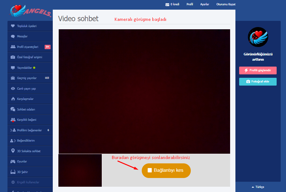 Kameralı gay sohbet sitesi AngelsTurkiye’nin görüntülü görüşme modülü hakkında detaylar görsellerle birlikte sayfanın sonunda. Öte yandan gizli eşcinsel erkekler için tüyo niteliğinde olan bir kaç bilgi paylaşımı ve özellikle gizlilik içinde iletişimde olabileceğiniz gay arkadaşlık uygulaması hakkında detaları mutlaka oku.